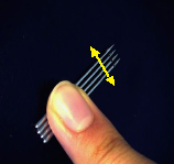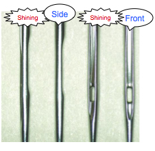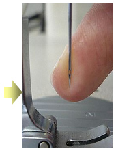 Check the bottom of the scarf, the needle eye and the groove using a loupe to insert the needle correctly. Without a loupe, fingering on the needle eye as shown to right makes it easy to find the needle eye direction.