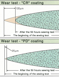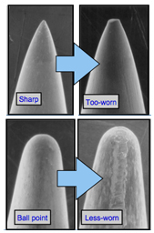 Compare a damaged needle point with a normal one using a loupe and microscope.
